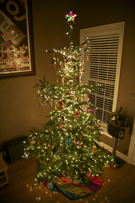 I challenge myself every year to see how close I can get the star to the ceiling. We were right on the money this year.I think you could barely pass a sheet of paper between the ceiling and the star. And we might have gone a little overboard with ornaments this year....but... here it is...